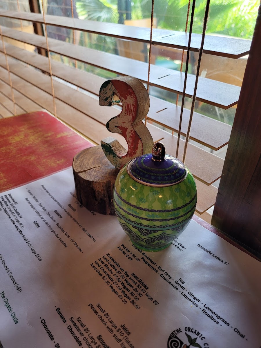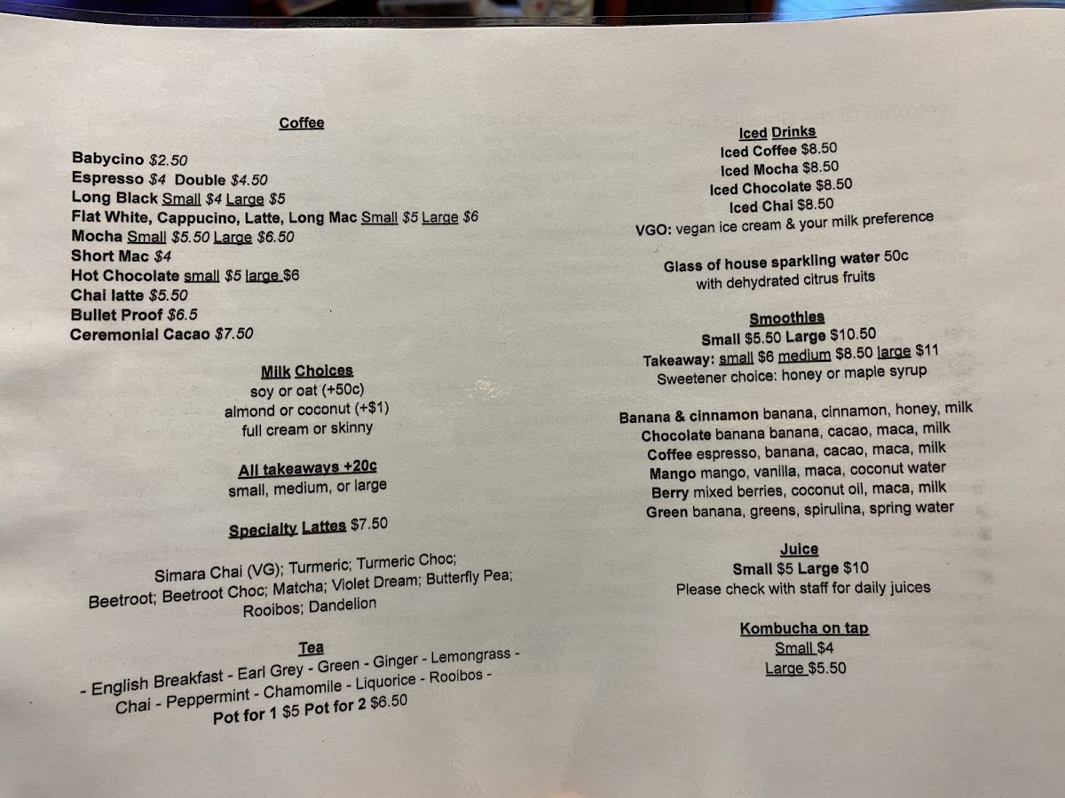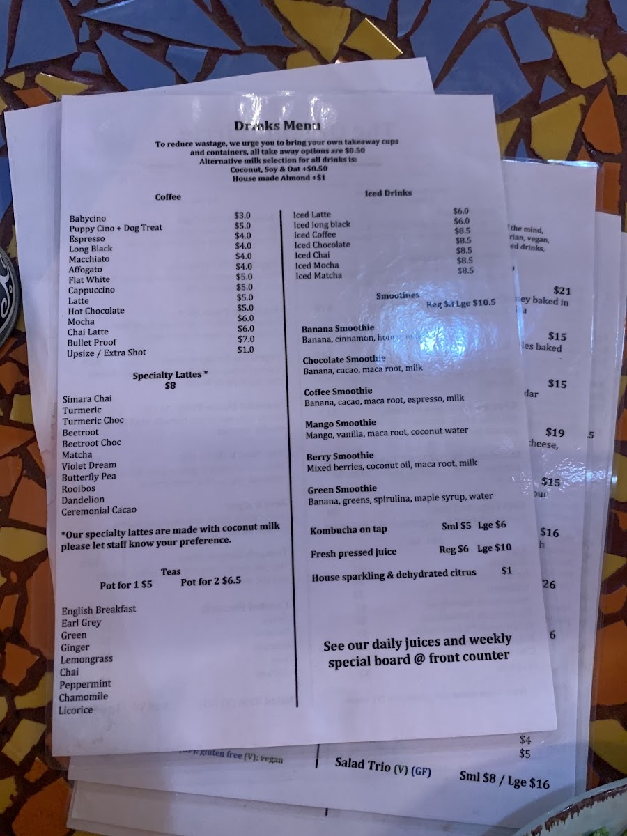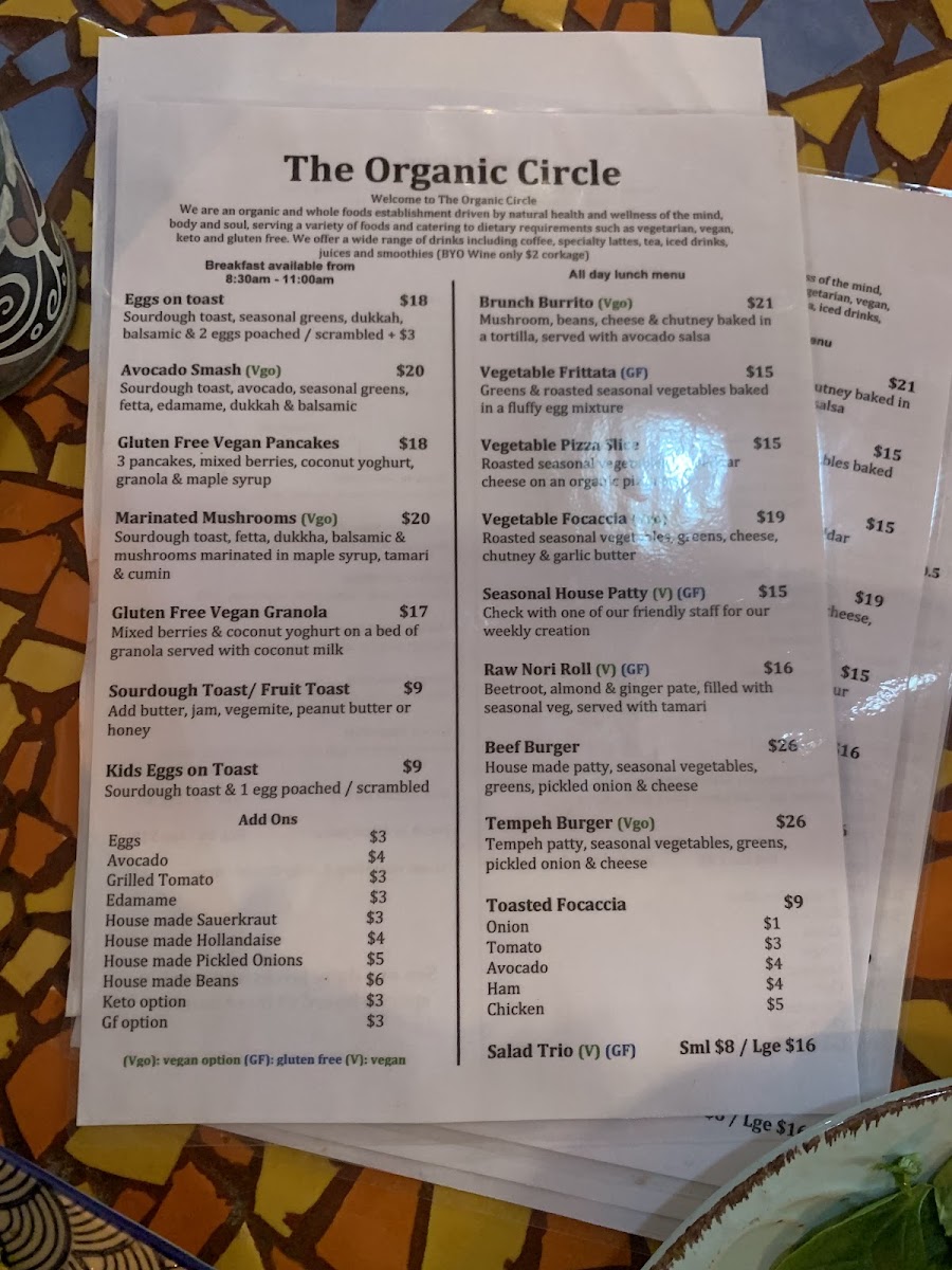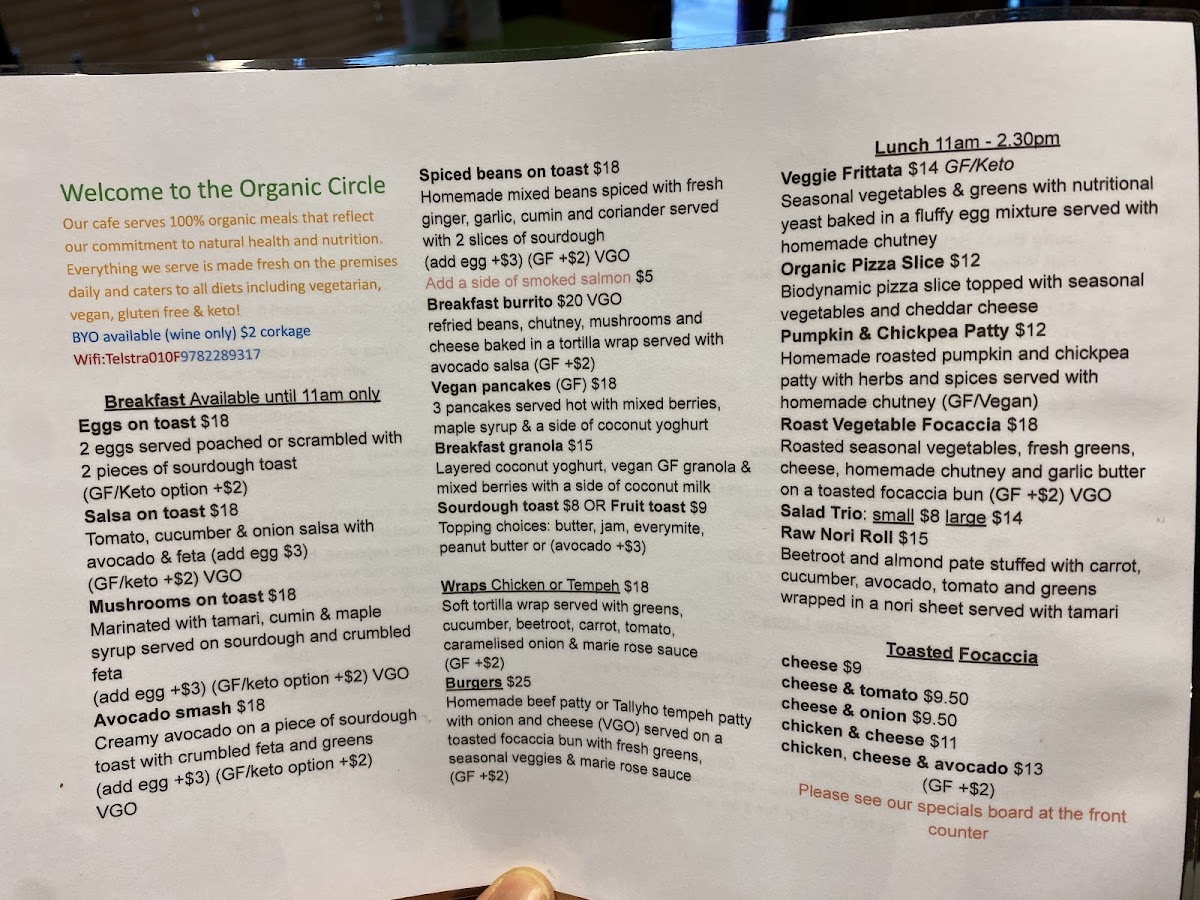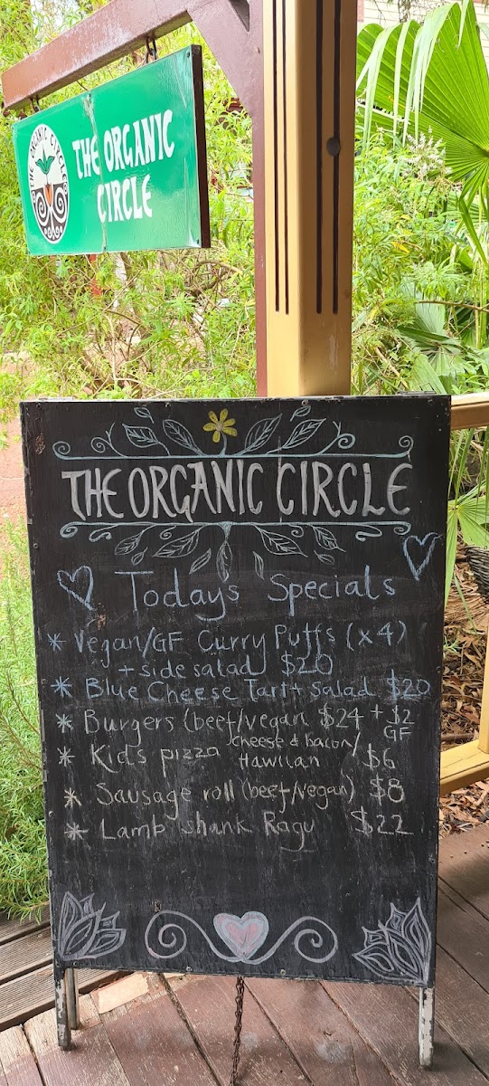 The menu at The Organic Circle in Armadale offers a delightful range of organic options perfect for both breakfast and lunch. For breakfast, enjoy simple yet satisfying dishes like Eggs on Toast, Salsa on Toast, and Mushrooms on Toast, with each dish showcasing fresh ingredients. The Avocado Smash and Spiced Beans on Toast are also great choices for a healthier start to the day. Moving into lunch, the menu features a variety of flavorful options such as the Veggie Frittata, the hearty Pumpkin & Chickpea Patty, and the satisfying Roast Vegetable Focaccia. For something a bit more indulgent, the Organic Pizza Slice and Salad Trio are worth trying. The toasted focaccia offerings are also popular, with options like Cheese, Cheese & Tomato, and the more filling Chicken & Cheese or Chicken, Cheese & Avocado. The drink selection includes a rich variety of coffee options, including Babycino, Espresso, and Long Black, as well as refreshing iced drinks like Iced Latte and Iced Coffee. For something unique, try the Simara Chai or Turmeric Choc specialty lattes. Today's specials feature enticing dishes like the Blue Cheese Tart + Salad, juicy Burgers, and the savory Lamb Shank Ragu. For smoothies, the Banana Smoothie and Mango Smoothie offer a sweet, energizing pick-me-up. All in all, The Organic Circle provides an inviting and diverse menu that emphasizes organic and wholesome ingredients, with something for every palate.